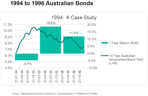 As shown in the chart below, Australian 10-year bond returns fell into negative territory in 1994 as bond yields (interest rates) rose. But, over the course of 1995 and 1996, bond returns rose sharply as yields declined from their peak above 10 per cent.