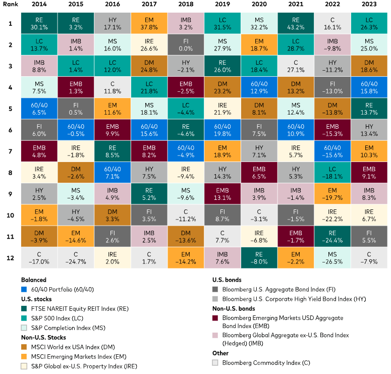 Notes: Large-cap U.S. stocks are represented by the S&P 500 Index, mid-cap and small-cap U.S. stocks by the S&P Completion Index, developed non-U.S. stock markets by the MSCI World ex USA Index, and emerging markets by the MSCI Emerging Markets Index. Commodities are represented by the Bloomberg Commodity Index, U.S. real estate by the FTSE NAREIT Equity REIT Index, and non-U.S. real estate by the S&P Global ex-U.S. Property Index. U.S. investment-grade bonds are represented by the Bloomberg U.S. Aggregate Bond Index, U.S. high-yield bonds by the Bloomberg U.S. High-Yield Bond Index, non-U.S. bonds by the Bloomberg Global Aggregate ex-U.S. Bond Index (Hedged), and emerging markets bonds by the Bloomberg Emerging Market USD Aggregate Index. The 60/40 Portfolio is represented by the indexes listed in the proxy description in footnote 1. The Spliced Total Stock Market Index includes the MSCI U.S. Broad Market Index through June 2, 2013, and the CRSP US Total Market Index thereafter.